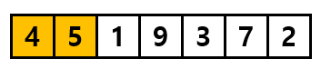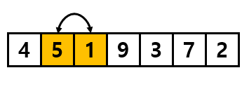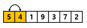위 그림에서는 첫 비교가 5와 4이기 때문에 5와 4를 비교했을 때 왼쪽 값이 더 크기 때문에 두 값의 위치를 바꾸어 줍니다.