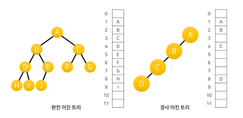 경사 이진 트리같은 경우에는 위 오른쪽 그림철머 배열에 빈 공간이 생기기 때문에 불필요한 공간이 낭비 될 수 있고 배열 크기를 넘어가는 노드를 추가할 수 없다는 점이 단점입니다.