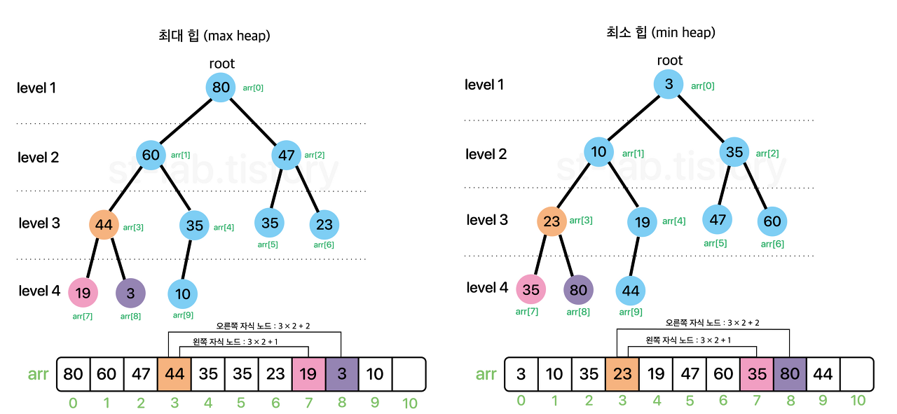아래 그림을 살펴 보면서 최대 힙과 최소 힙을 이해해 보겠습니다.