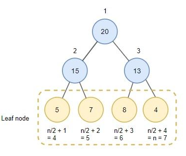 배열에 표현된 힙은 루트 노드의 index가 1이라고 할 때, n/2 + 1(중간에서 다음 칸) 부터 n(마지막 노드) 까지는 모두 leaf 노드라는 속성을 갖고 있습니다.