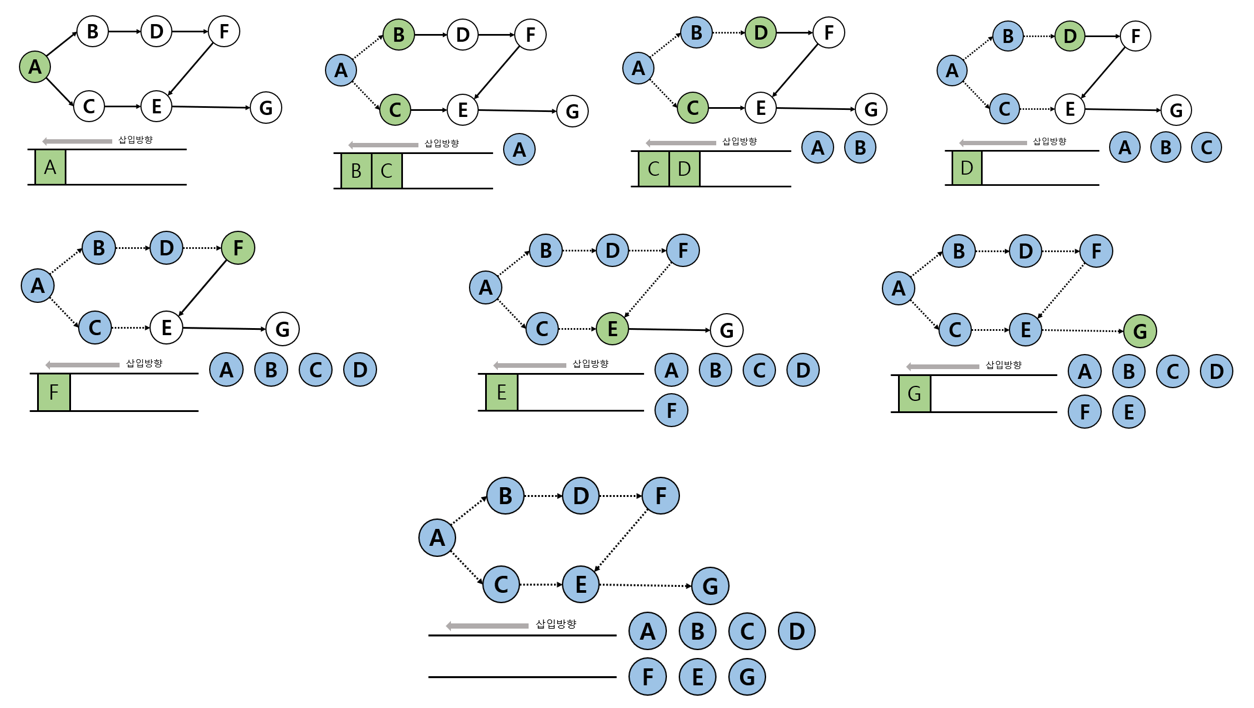 Queue(큐) 사용을 하게되는데 이는, 진입 차수를 계산하며 sorting하는 방식이기 때문입니다.
